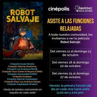 La proyección de Robot Salvaje denominada “Función Relajada” se realizarán los fines de semana de octubre, es decir, del 11 al 13; 18 al 20 y 25 al 27 en horarios de entre las 11:00 horas y 14:00 horas. Por el momento sólo 9 salas de todo el país han sido seleccionadas para ofrecer este tipo de funciones pensadas en la empatía y el respeto, entre ellas Cinépolis Plaza las Américas de la Ciudad de Xalapa.