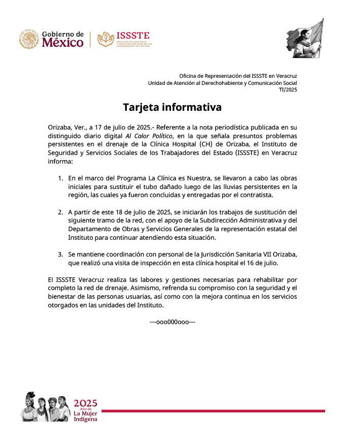 ISSSTE ya realiza trabajos para arreglar drenaje en Clínica Hospital de Orizaba