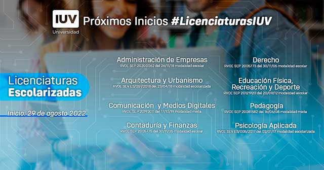 IUV Universidad; institución educativa que figura actualmente como la opción ideal para una nueva generación de profesionales que viven al ritmo del siglo XXI, ya que su modelo educativo prioriza la innovación y privilegia la flexibilidad, además de que todos sus programas oficiales cuentan con Reconocimiento de Validez Oficial de Estudios (RVOE)