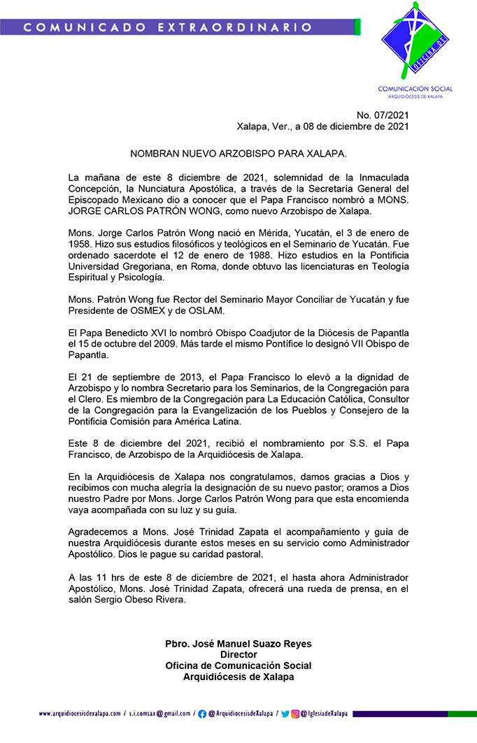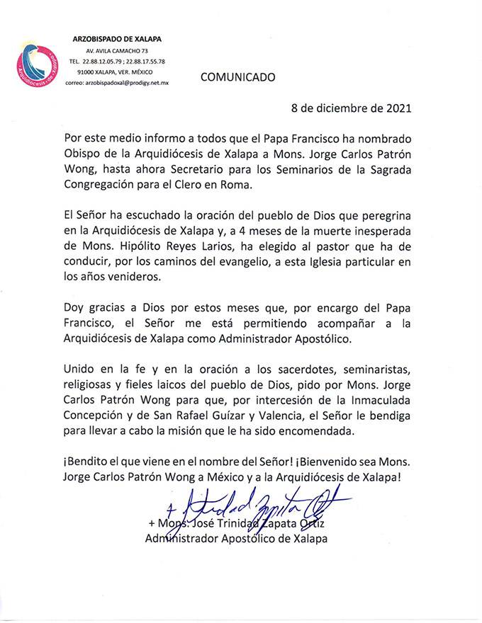 Por medio de un comunicado expresó: "informo a todos que el Papa Francisco ha nombrado Obispo de la Arquidiócesis de Xalapa a monseñor Jorge Carlos Patrón Wong, hasta ahora Secretario para los Seminarios de la Sagrada Congregación para el Clero en Roma".