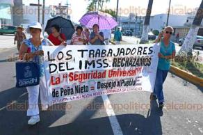 Un grupo de jubilados del Instituto Mexicano del Seguro Social, marcharon por la avenida Salvador Díaz Mirón, inconformes por la presunta privatización del IMSS, y piden a la sociedad se una al reclamo, pues hay beneficios para el resto de la población, como son: las pensiones, las guarderías, entre otras cosas.