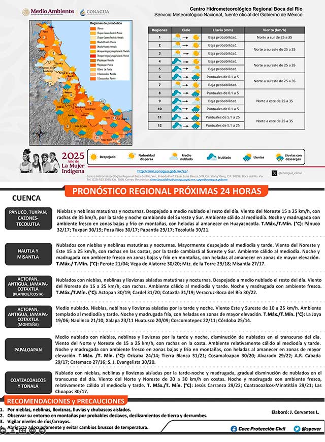 Una alta presión tiene un centro sobre el norte y noreste del País, además una vaguada se extiende sobre el suroeste del Golfo de México. Mientras la onda tropical número 40 ha ingresado al este del Océano Pacífico. En Veracruz, se espera un jueves nublado con nieblas, lloviznas y lluvias y chubascos aislados cuencas del sur, mientras, en el norte, dominará tiempo mayormente despejado, con nieblas nocturnas en llanuras y costas y nocturnas en montaña. El viento será del noreste y este, cambiando al sureste y sur esta tarde y noche. Las temperaturas diurnas serán relativamente altas, con ambiente frío por la tarde y noche, con heladas en partes elevadas de montaña. El pronóstico indica que entre viernes y sábado dominará tiempo mayormente despejado, con baja probabilidad de lluvias. Sin embargo, el domingo es probable la llegada a la región de un frente frío, impulsado por una masa de aíre ártico que cambiará rápidamente las condiciones del tiempo. Para más información consulta la Alerta Gris por frente frío y masa ártica.