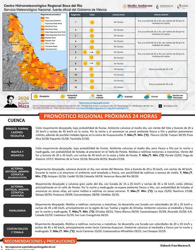 Para este día dominará cielo despejado, con ambiente caluroso al mediodía. Sin embargo, por la noche a madrugada permanecerá fresco a frío. Evento de surada con rachas de 45 a 65 kilómetros por hora en la zona de Orizaba, Los Tuxtlas y entre Jesús Carranza-Acayucan.