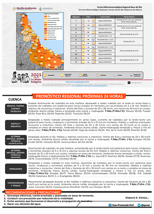 Hoy se espera ambiente diurno cálido y bajo potencial de lluvias en la mayor parte del Estado, excepto en montañas, donde se prevén lluvias, chubascos o tormentas aisladas por la tarde-noche.