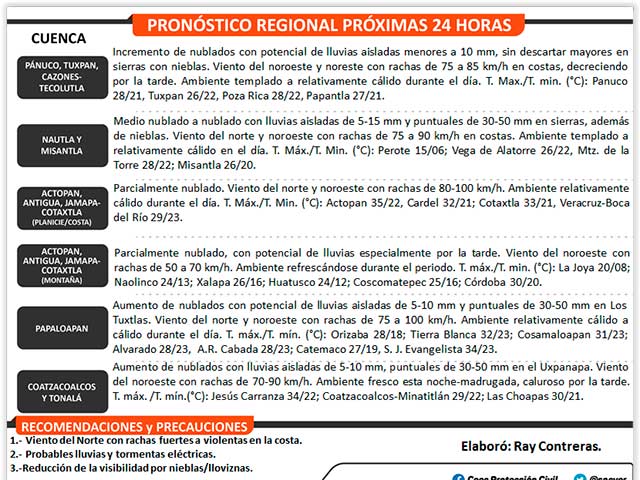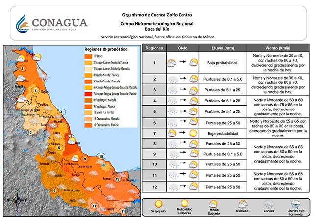 En la costa, el viento del Norte puede registrar rachas entre 80-100 kilómetros por hora en costa central (Laguna Verde hasta Alvarado); 70-90 kilómetros por hora en costa norte-sur y 55 a 70 kilómetros por hora entre Misantla y Xalapa.