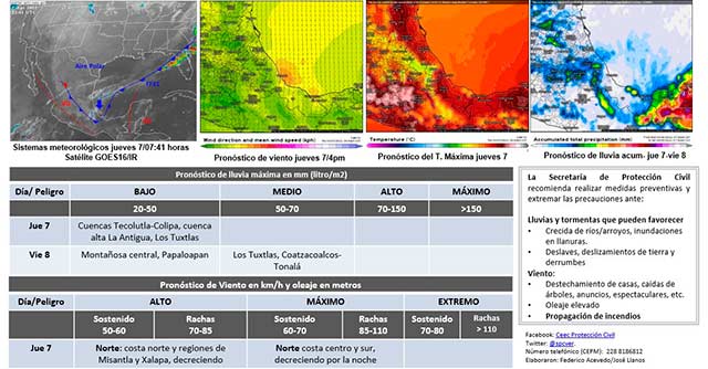 A su paso se espera el incremento de nubosidad con lluvias dispersas de 5 a 20 milímetros en promedio, puntuales de 30-50 milímetros en sierras de Huayacocotla a Misantla, Los Tuxtlas y el Uxpanapa. Asimismo, es posible la presencia de nieblas vespertinas a nocturnas en zonas serranas reduciendo visibilidad.