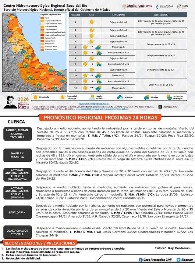 En los siguientes días dominará ambiente diurno cálido y bajo potencial de lluvias en la mayor parte de Veracruz, sin descartar algunos eventos aislados por las tardes sobre las regiones montañosas. Tome sus precauciones.