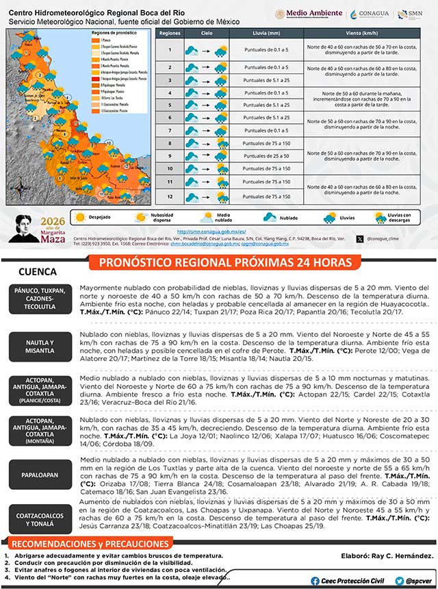 El frente frío 33 cruza el centro-sur de Veracruz. A su paso genera nublados con probabilidad de nieblas, lloviznas y lluvias dispersas más importantes en montañas y en cuencas del sur. El viento del norte será fuerte con rachas de 75 a 90 kilómetros por hora en la costa y menores en montaña, oleaje elevado y marcado descenso de temperatura, con ambiente frío, heladas y cencellada en alta montaña.