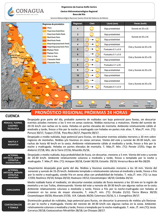 La influencia de un amplio sistema de alta presión en el Golfo de México, en apoyo con subsidencia del viento en altura, favorece condiciones de tiempo más estables, con disminución de nublados y del potencial para lluvias en gran parte del Estado de Veracruz, sin descartar menores a 10 milímetros de forma aislada y de corta duración en el centro y cuenca del Papaloapan, así como de nieblas y/o lloviznas por la noche y madrugada en regiones de montaña.