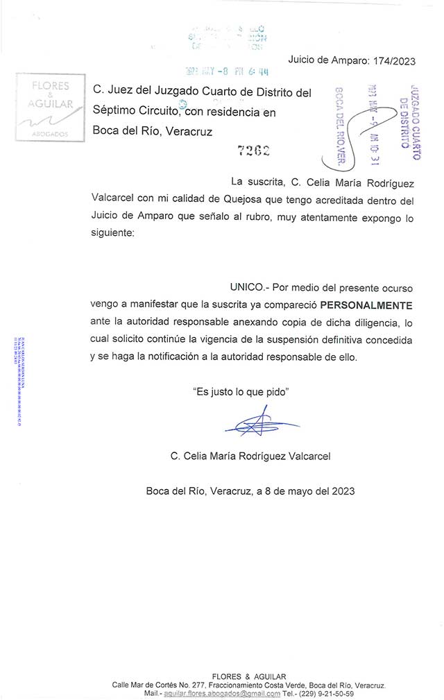 “La Juez de Control, en respuesta a diversos escritos en los que le solicité que fijara fecha de audiencia inicial, indicó que el 16 de mayo de 2023 se celebrará dicha audiencia. No obstante, por fuentes cercanas a los nuevos abogados de Manuel Rodríguez Fernández y Celia María Rodríguez Valcárcel, así como de amigos y familiares de los mismos, tuve conocimiento de que los investigados han manifestado que tienen mucho dinero para conseguir burlarse de la justicia penal del Estado de Veracruz; por lo que dicen que sólo se presentarán a la audiencia a cumplir con un protocolo, pero que ya han arreglado con otras autoridades su situación jurídica, ello con la finalidad de no hacerse cargo del daño que me causaron, que asciende a más de 30 millones de pesos, y con salir del país para no enfrentar el proceso.