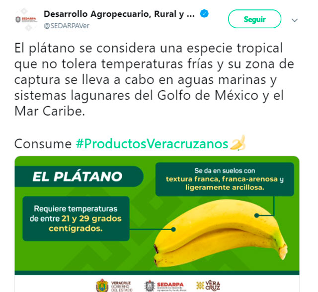 Por redes sociales, la Secretaría de Desarrollo Agropecuario de Veracruz difundió que el plátano, como si fuera pez, se “captura en aguas marinas y sistemas lagunares del Golfo de México y el Mar Caribe”. Lo retiraron a las 13:25 horas de este jueves 19.