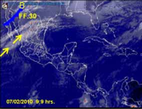 La entrada de aire marítimo tropical con moderado contenido de humedad hacia la vertiente oriental del país, ocasiona esta mañana sobre la región cielo medio nublado. La corriente de vientos máximos (nubosidad media y alta hacia Norte y Noreste del país. Frente frío No. 30 se extiende desde un sistema de baja presión ubicado sobre el Suroeste de los Estados Unidos hasta la parte media de la Península de Baja California.