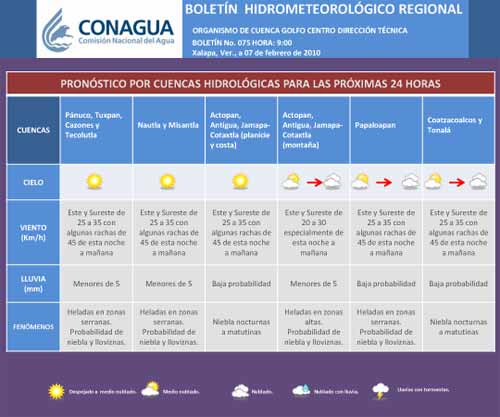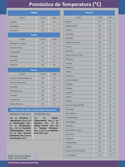 La entrada de aire marítimo tropical provocará que en la región la temperatura diurna continúe recuperándose, asimismo mantiene la probabilidad de algunas nieblas, lloviznas y lluvias ligeras nocturnas especialmente en zonas montañosas. El frente frío No. 30 se extenderá la mañana del lunes desde un sistema de baja presión ubicado en Texas hasta el Sur de la Península de Baja California; esta situación, reforzará la entrada de aire marítimo tropical hacia la vertiente oriental del país, la cual podría favorecer cierta probabilidad de un evento de “Surada” en la zona de Orizaba con algunas rachas de 40 km/h. alta presión y masa de aire frío que se le asocia afecten a la región hacia el mediodía del martes con aumento del potencial de lluvias, descenso de temperatura y viento del Norte en la costa de 45 a 55 km/h y rachas de 75 km/h, el cual tendería a disminuir gradualmente hacia la mañana del miércoles. Un nuevo frente frío podría arribar a la región entre la tarde del jueves a mañana del viernes