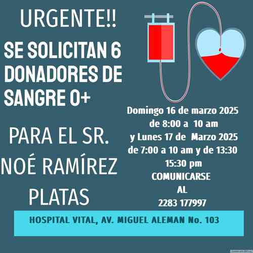 El señor Noé Ramírez Platas necesita transfusiones de tipo de sangre O+; dejan número de contacto