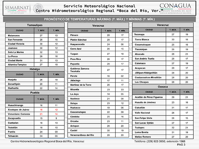 El viento será componente Este de 20 a 30 km/h. El ambiente diurno en planicies y costa se espera cálido a caluroso y en regiones montañosas será templado a fresco, durante la noche y madrugada será frío especialmente sobre zonas serranas en límites de Veracruz con Puebla.