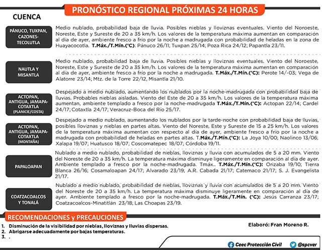 Para este día se prevén periodos de sol prolongados, por lo cual la temperatura máxima aumentaría ligeramente; sin embargo, por la noche a madrugada se mantendrá el ambiente fresco a frío. Bajo potencial para lluvias, con algunos eventos en la región de Los Tuxtlas y Coatzacoalcos, presencia de nieblas o neblinas.