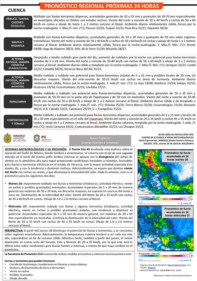 Durante esta jornada dominará tiempo muy inestable con lluvias-chubascos y tormentas dispersas (viento arrachado, descargas eléctricas y granizadas), el viento del Norte podría alcanzar rachas de 45 a 60 kilómetros por hora en costas y el ambiente diurno refresca ligeramente, esto como resultado del avance del Frente Frío número 45 sobre el noroeste del Golfo de México que induce el fortalecimiento de dos vaguadas, una de norte a centro del territorio nacional y otra frente a costas de Veracruz. Consulte el Aviso Especial y extreme precauciones.