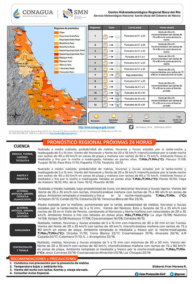 Esta mañana amanece con cielo mayormente en el centro y algunos sectores del norte y sur de la entidad, condiciones que prevalecerán durante esta mañana. Bajo potencial para lluvias y ligero aumento de las temperaturas máximas, viento del norte y noroeste de 20 a 35 kilómetros por hora y rachas de 40 a 50 kilómetros por hora. En horas de la tarde se prevé aumento de nublados y del potencial para lluvias, registrándose los máximos acumulados en la región de Los Tuxtlas y sur de la entidad, con acumulados de 30 a 50 milímetros, así como nieblas, neblinas y lloviznas. Se mantiene el ambiente frío con posibles heladas en partes altas.