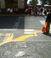 La misma está pintada de amarillo, lo que la hace reluciente y brillosa que al contacto con el calzado del que pasa por ahí los hace resbalar y derrapar, inclusive en otras similares esquinas, en ella que es el caso que nos ocupa, según boca de la persona que obsequia un periódico de corte de Izquierda; de las 9 de la mañana a las 2 de la tarde resbalan y caen un número de 9 a 10 personas llevándose con ello raspones luxaciones e inclusive un golpe fatal.