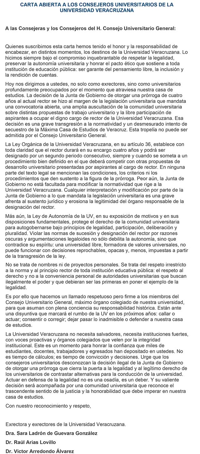 Llaman Exrectores UV a consejeras/os a desconocer decisión ilegal de la J de G