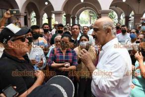 Integrantes del movimiento "Pueblos Unidos por Veracruz" se manifestaron esta mañana, cerrando temporalmente la calle Enríquez a la altura del Palacio Municipal en demanda de apoyos y malos tratos por parte de trabajadores del Ayuntamiento.