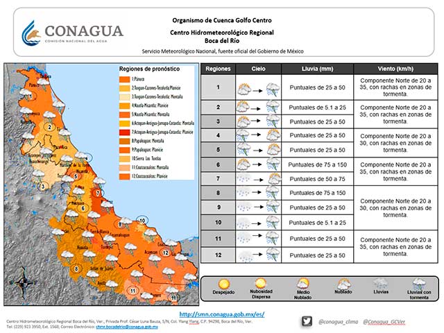 La amplia zona de baja presión con alta probabilidad de desarrollo ciclónico localizada frente a la costa de los Estados de Guerrero y Michoacán, continuará inmersa en la vaguada monzónica, su circulación permitirá el flujo de humedad hacia el interior del país, que al combinarse con los efectos de una vaguada extendida sobre el oriente del territorio nacional y occidente del golfo de México, además de la divergencia en altura, mantendrán el temporal de lluvias en el oriente mexicano, con lluvias aisladas y chubascos (5.1 a 25 mm) en forma dispersa desde el Pánuco hasta el Tonalá; lluvias puntuales fuertes (25 a 50 mm) se esperan en partes altas desde el Pánuco hasta la cuenca de La Antigua, incluyendo zonas costeras desde Veracruz hasta Tuxpan ; lluvias muy fuertes (50 a 75 mm) a puntuales intensas (75 a 150 mm) se prevén en partes altas de las cuencas del Jamapa-Cotaxtla y Papaloapan. En Tamaulipas, se prevén lluvias con intervalos de chubascos (5.1 a 25 mm) generalizados en la mayor parte de la entidad, tormentas puntuales fuertes (25 a 50 mm) se esperan en el suroeste de la cuenca central, la región Mante y Sur, además de partes altas y bajas del Río Bravo. En algunos casos, las lluvias estarán acompañadas de actividad eléctrica y viento en rachas.
