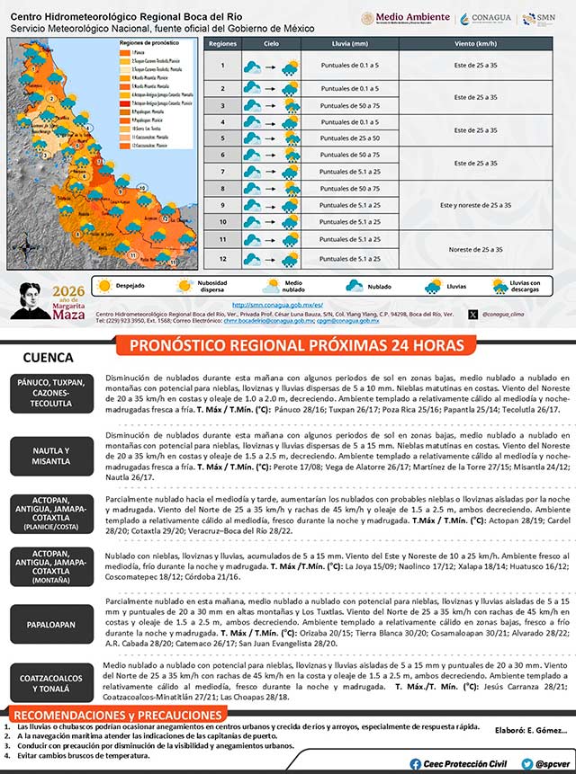 Durante este miércoles la interacción de un canal de baja presión que se extenderá a lo largo del noreste del territorio nacional y la vertiente oriental con un patrón de divergencia en la atmósfera superior, además del ingreso de humedad y los efectos orográficos ocasionarán el desarrollo de nublados vespertinos a nocturnos con probabilidad para tormentas fuertes en porciones medias y altas de las cuencas de los ríos Tecolutla, Nautla, Actopan, La Antigua, Jamapa-Cotaxtla y Papaloapan