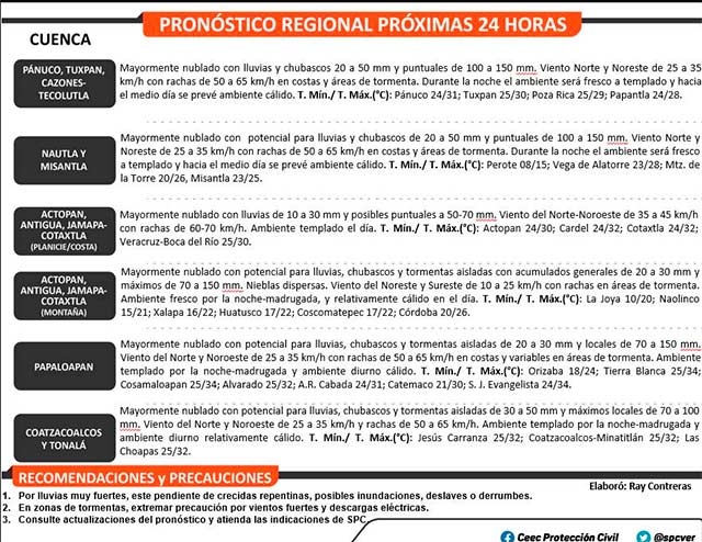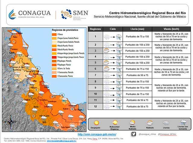 Durante este domingo la onda tropical número 6 que se desplaza inmersa en una zona de baja presión que presenta probabilidad para desarrollo ciclónico se desplazarán sobre el suroeste y occidente del Golfo de México y la región; ocasionarán el desarrollo de nublados con probabilidad para lluvias intensas (75 a 150 mm) a puntuales torrenciales (150 a 250 mm) desde la cuenca del río Pánuco hasta el Jamapa, parte alta del Papaloapan y en Los Tuxtlas; lluvias puntuales muy fuertes (50 a 75 mm) en las cuencas de los ríos Coatzacoalcos y Tonalá, así como en la costa central; chubascos con tormentas puntuales fuertes (25 a 50 mm) en el resto del estado de la entidad veracruzana.