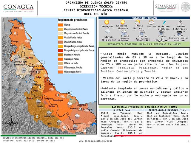 La onda tropical No. 8 continuará con su desplazamiento hacia el oeste, acercándose gradualmente al sur de Veracruz, localizándose durante la tarde y noche sobre el centro de dicho Estado, situación que mantendrá la condición de cielo medio nublado a nublado. Se espera que el potencial de lluvias se distribuya de la siguiente forma: lluvias generalizadas de 25 a 50 mm en la región norte y sur, con puntuales de 75 a 100 mm especialmente en la parte alta de las cuencas de los ríos Tuxpan, Cazones, Tecolutla, así como en la cuenca del Papaloapan, Coatzacoalcos y Tonalá, en el centro del Estado, se prevén lluvias de 5 a 25 mm con eventos puntuales cercanos a 75 mm en la parte alta de la cuenca del Actopan y Jamapa-Cotaxtla. El viento fluirá del Norte y Noreste de 20 a 30 km/h; en tanto que, la temperatura continuará favoreciendo ambiente templado en zonas montañosas y cálido a caluroso en zonas de planicie y costa, siendo posible que durante las noches y madrugadas el ambiente sea frío a fresco en zonas serranas.