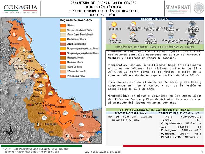 a nublado con baja probabilidad de lluvia y viento débil, los valores de temperatura se mantendrán bajos. En el cofre de Perote y Pico de Orizaba se pronostica la caída de aguanieve así como heladas severas en zonas serranas.