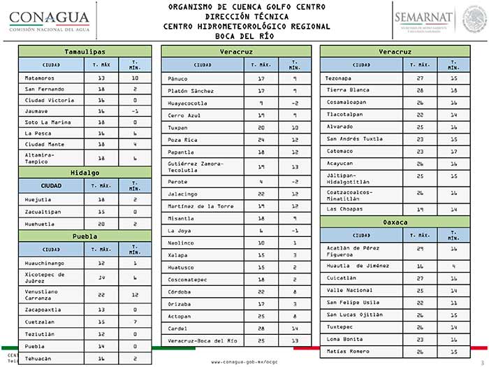 En el transcurso del día la masa de aire frío comenzará a desplazarse hacia el Este lo que permitirá que el viento se fije del sur en el norte de Veracruz y del Este y Sureste en el centro y sur de la región, en ambos casos será de 25 a 35 km/h, favorecerá la entrada de aire cálido y con bajo contenido de humedad del Golfo de México hacia la vertiente oriental del país.