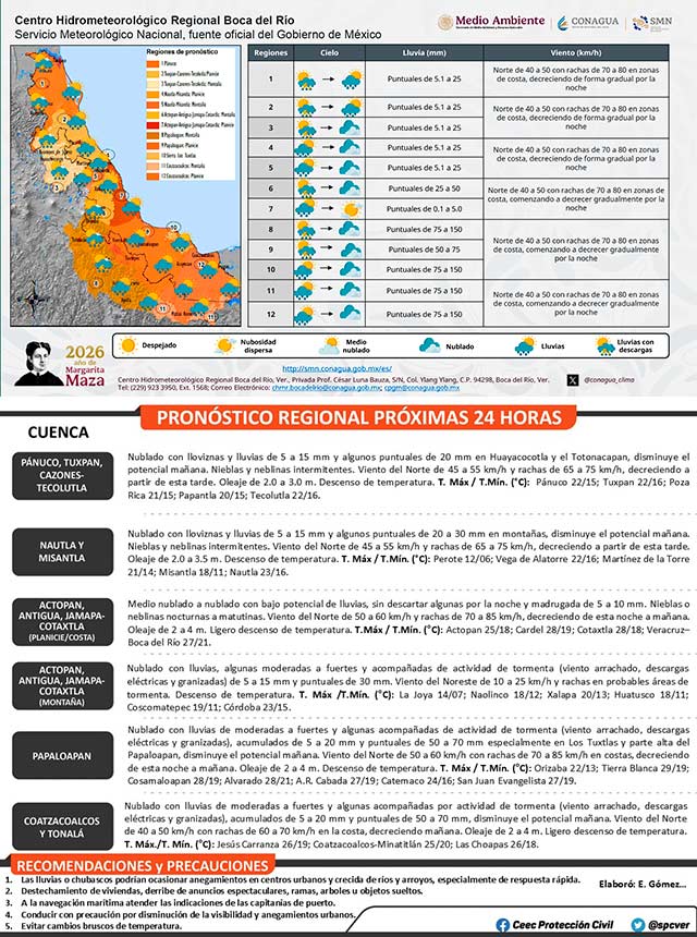 Lunes 6: Nublado con lluvias y tormentas, con acumulados de 5 a 20 milímetros en promedio en el estado y máximos de 50 a 70 milímetros en las partes altas de las cuencas del Papaloapan al Tonalá y la región de Los Tuxtlas y de 20 a 50 milímetros en la región montañosa central y en el resto de las cuencas del sur, sin descartar mayores. Viento del Noroeste y norte de 40 a 50 kilómetros por hora con rachas de 70 a 85 kilómetros por hora en las costa norte y centro y de 50 a 65 kilómetros por hora en la costa sur. Ambiente templado a caluroso y se mantiene ambiente templado a fresco a frío por la noche y madrugada. Oleaje de 2.0 a 4.0 metros en las proximidades de la costa.