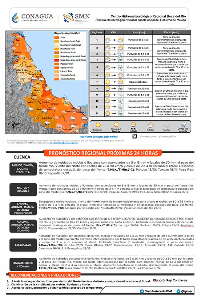 Pronóstico para el estado de Veracruz: conforme avance aumenta las condiciones para nieblas, lloviznas y lluvias con algunas tormentas, con acumulados estimados en 24 horas de 5 a 20 milímetros de forma general en el estado y máximos de 50 a 70 milímetros especialmente en la zona sur (consulte tabla, sin descartar valores más altos), asimismo el viento del norte se generaliza e intensifica con rachas máximas de 80 a 95 kilómetros por hora en la costa centro y de 75 a 90 kilómetros por hora en las costas norte y de 65 a 80 kilómetros por hora en la sur, disminuyendo durante el sábado. Entre hoy y mañana sábado 11 el oleaje puede alcanzar alturas de 2 a 4 metros. Hoy la temperatura máxima disminuye en la zona norte y aumenta ligeramente del centro al sur, registrándose un sábado con ambiente frío a templado al mediodía y frío por la noche a madrugada con probabilidad de heladas en partes altas.
