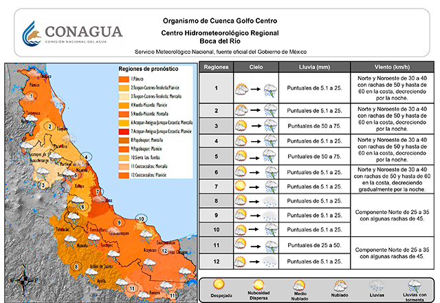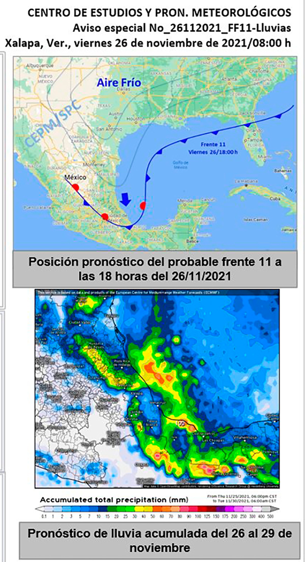 Esta mañana, el Frente Frío número 11 se localiza extendido desde el noreste de Estados Unidos, hasta el norte de Veracruz, esperando recorra el Estado con tendencia a estacionarse sobre la región sur durante la tarde de hoy. A su paso estará aumentando el potencial de lluvias/lloviznas en la mayor parte de la entidad, con acumulados de 30 a 50 milímetros o mayores, principalmente en la región de Nautla-Misantla, la parte baja del Papaloapan y Coatzacoalcos y menores en montañas.