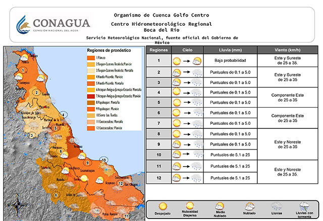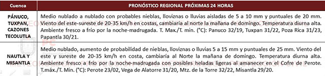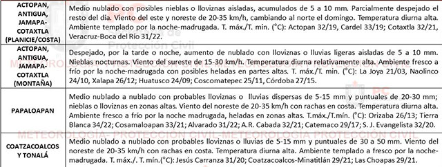 Temperaturas diurnas altas y ambiente cálido. Viento del Sureste, Este y Noreste débil con rachas moderadas. A partir del domingo se incrementaría el potencial de lluvias y tormentas, el viento se fijaría del Norte y se intensificaría en la costa, se asociaría al fortalecimiento de la vaguada por la aproximación del Frente Frío 13 y su masa de aire frío que recorrerían Veracruz de la noche de domingo al lunes. Para más información consulte la Alerta Gris.