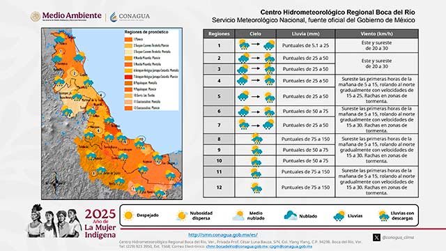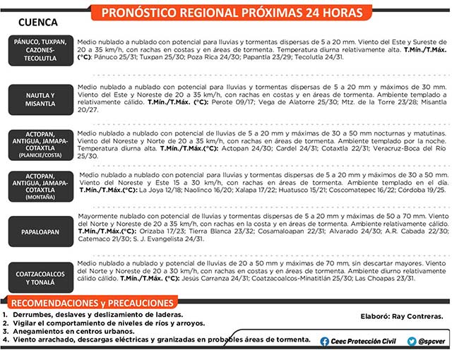 El eje de la onda tropical número 20 se mueve sobre y al sur de Veracruz e interacciona con la vaguada en el suroeste del Golfo de México y el disturbio tropical 91E al sur de Oaxaca. Tales sistemas se apoyan con el viento en altura, para favorecer la presencia de nublados con potencial de lluvias y tormentas en el transcurso del día en Veracruz, donde se esperan eventos de ligera a moderada intensidad, aunque pueden ocurrir algunos localmente fuerte especialmente en cuencas del centro y sur. El viento será del norte y noreste moderado, con rachas de 40 a 50 kilómetros por hora en el valle de Perote y Orizaba, y mayores en áreas de tormentas. El ambiente diurno se prevé templado en montañas y relativamente cálido en planicie y costa. Extreme precauciones por anegamientos urbanos, crecida de ríos y arroyos de respuesta rápida, viento arrachado, descargas eléctricas y algunas granizadas en las probables áreas de tormenta, entre otros efectos negativos.