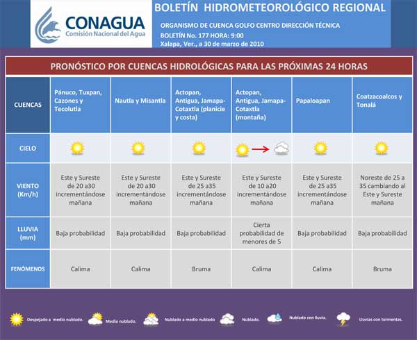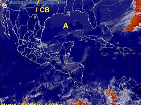 El sistema de alta presión y masa de aire frío (A) que cubre el Golfo de México modifica sus características térmicas, se mueve hacia la costa atlántica de los Estados Unidos. Un canal de baja presión (CB) se extiende del centro de la Unión Americana hasta el Norte de México. Estos dos sistemas están interaccionando y favorecen la entrada de aire marítimo tropical con ligero contenido de humedad hacia la vertiente oriental del país, mismo que ocasiona esta mañana en la región cielo despejado a medio nublado.