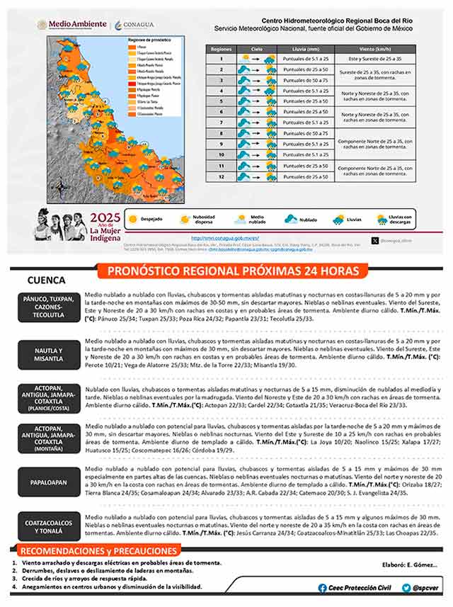 Un sistema frontal estacionario sobre el norte del Golfo de México, una vaguada con eje en el suroeste del mismo golfo y otra de norte a centro del País mantienen abundante flujo de humedad hacia Veracruz, donde la divergencia del viento en altura favorece nublados con lluvias aisladas esta mañana, principalmente en costas y áreas marítimas. Se prevé que estos sistemas persistan durante este inicio de semana asociados con potencial para lluvias, chubascos y tormentas generalmente matutinas y nocturnas en costas y por las tardes-noches en montañas. El viento del suroeste, este, noreste y norte moderado en costas y el ambiente diurno de tempolado a cálido.