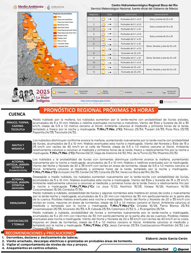 Vaguadas con eje sobre el suroeste del Golfo de México y otra en el noreste del País favorecen esta mañana la presencia de algunos nublados con lluvias, chubascos y actividad de tormentas en la costa central, los cuales disminuirán conforme avance la mañana, pero aumentarán nuevamente durante la tarde, noche y madrugada, con los acumulados más importantes en las cuencas del sur. El viento en la costa se prevé del sureste, este y noreste, moderado con rachas en zonas probables de tormenta, oleaje de 0.5 a 1.0 metros cercano al litoral. Ambiente diurno cálido y bochornoso, fresco a relativamente frío en zonas de montaña y templado en regiones de planicie y costa. Se recomienda extremar precauciones por efectos secundarios de las lluvias, las cuales pueden estar acompañadas de viento arrachado y descargas eléctricas.