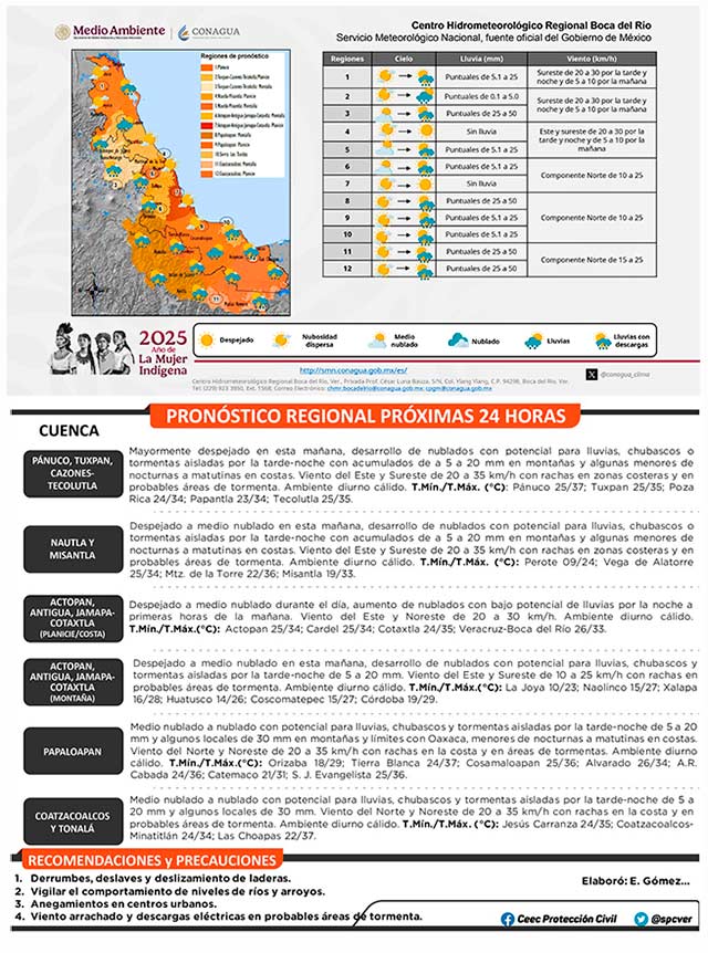 El pronóstico indica un inicio de semana con la presencia de 2 vaguadas, uno de norte a centro del país y otra sobre el suroeste del Golfo de México para mantener el ingreso de humedad hacia Veracruz, donde en combinación con los periodos de sol prolongados ocasionarán ambiente diurno cálido y bochornoso. Por su parte el potencial de lluvias y tormentas dominará por las tardes-noches especialmente sobre regiones montañosas del norte y centro de la entidad, así como en la zona sur, menores de nocturnas a matutinas en el resto.