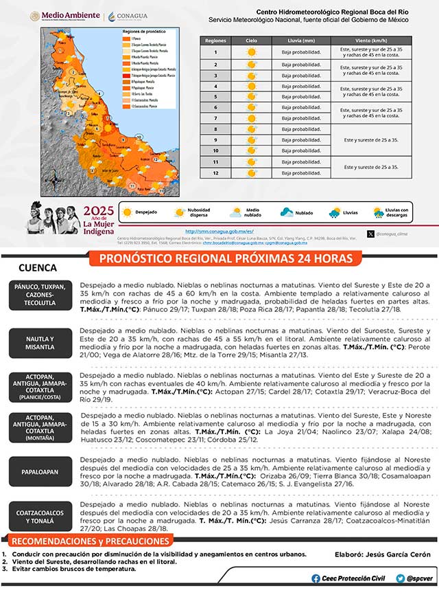 Se localiza una alta presión sobre el Golfo de México, así como una circulación anticiclónica en niveles medios de la atmósfera, lo que favorecerá en el estado de Veracruz baja probabilidad de lluvias. No se descartan nieblas o neblinas vespertinas a nocturnas en zonas de montaña y nocturnas a matutinas en llanuras y regiones costeras. El viento dominará del sur, sureste, este y noreste de 20 a 35 kilómetros por hora, con rachas de 45 a 60 kilómetros por hora en la costa norte, y oleaje de 1.0 a 1.5 metros cercano al litoral.