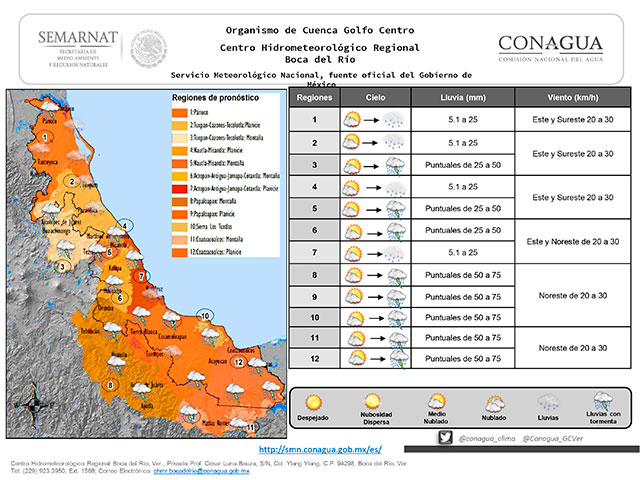 El pronóstico indica condiciones para lluvias-tormentas hasta el próximo miércoles por el paso de la onda tropical número 14 por el sur de México, situación que tendrá interacción con una vaguada en el suroeste del Golfo de México y ocasionarán condiciones de cielo mayormente nublado con potencial para lluvias-tormentas en gran parte del estado de Veracruz, las cuales hoy lunes principalmente se registrarían en horas de la tarde-noche en la zona norte-centro, mientras que en la zona sur podría presentarse a cualquier hora del día, el día martes se generalizarían las lluvias en territorio veracruzano.