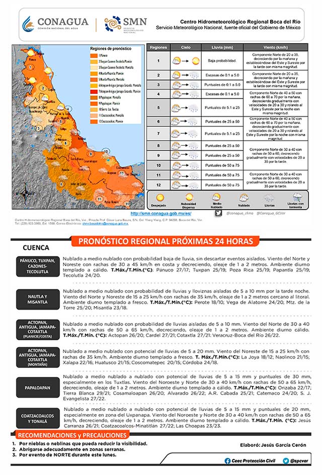 Viento del norte con rachas de 50 a 65 kilómetros por hora en costas, potencial de lluvias y tormentas aisladas, especialmente en la zona sur del estado. Las temperaturas máximas descienden el día de hoy, manteniendo ambiente diurno templado en gran parte de la entidad Veracruzana.