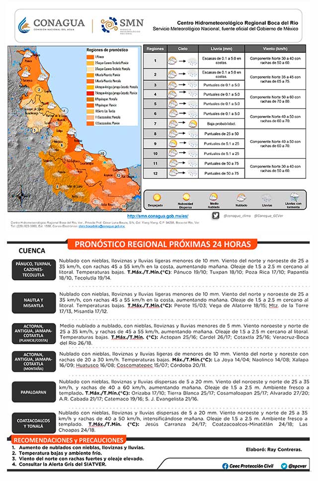 El frente número 24 se localiza esta mañana como estacionario sobre la sonda de Campeche, mientras que la masa de aire ártico cubre todo el Golfo de México y la entidad veracruzana, a su vez mantendrá el viento del norte de con rachas de 50 a 60 kilómetros por hora en la costa. Se prevé un día nublado, con nieblas, lloviznas y lluvias dispersas en toda la entidad. El ambiente diurno se prevé sea templado a fresco en llanuras y costas, y frío en montañas. Se estima que el frente frío número 24 reciba nuevos aportes de aire ártico mañana, prolongando el ambiente frío y ocasionando que el viento se intensifique con más fuerza para alcanzar rachas de 100 a 120 kilómetros por hora en la costa. Consulta la Alerta Gris