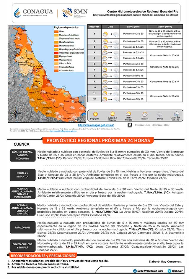 Esta mañana amanece con cielo medio nublado a nublado en gran parte de la entidad con áreas de lluvia ligera, nieblas y lloviznas, esperándose las más fuertes en la zona centro-sur y cuenca del Pánuco. El viento sigue del norte con velocidades moderadas a frescas. El ambiente se tornará fresco a frío.
