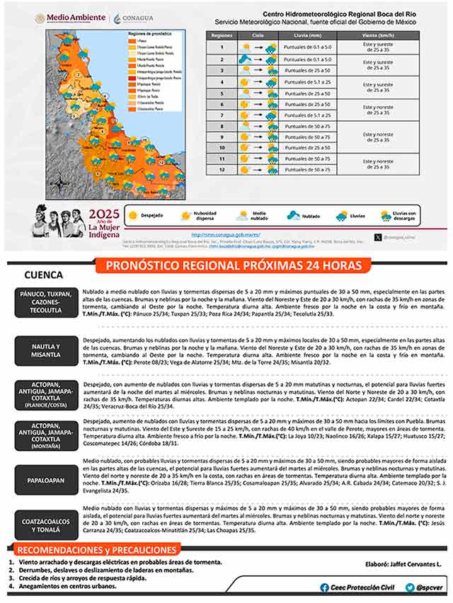 Se analiza una vaguada en el suroeste del Golfo de México y, en el Pacífico, la onda tropical número 25 se mueve al sur de las costas de Oaxaca. Además, en el Caribe, la onda tropical número 26 se aproxima al oriente de la Península de Yucatán. En Veracruz, se prevé un lunes despejado a medio nublado, con temperatura diurna alta y ambiente bochornoso. Desarrollo de nubosidad con potencial de lluvias y tormentas dispersas esta mañana en la costa norte y centro, y por la tarde y noche en montañas, con acumulados de 5 a 20 milímetros y máximos de 20 a 50 milímetros, especialmente en las cuencas del Papaloapan al Tonalá. El potencial de lluvias se extenderá a las cuencas del centro el martes. Viento del norte, noreste y este de 20 a 30 kilómetros por hora, con rachas en la costa, en áreas de tormentas y en montañas por la tarde. Oleaje de 0.5 a 1.0 metros en la costa. Consulte el Aviso Especial.
