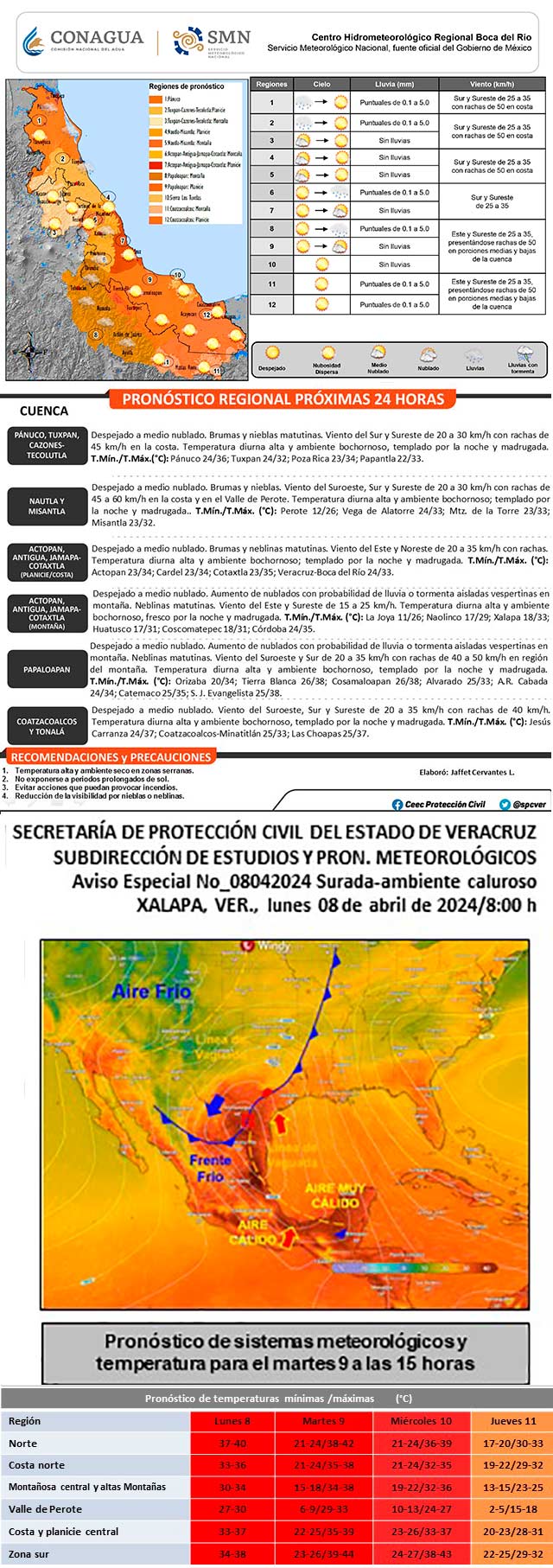 Un frente cálido se localiza en el centro de Estados Unidos, asocia su circulación con la de una dorsal que cubre el Golfo de México. En Veracruz favorece un lunes con brumas y neblinas matutinas, disminuyendo, periodos de sol. Temperaturas muy altas con ambiente cálido y seco.