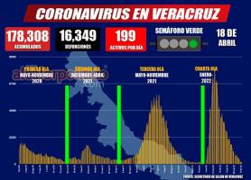 La Secretaría de Salud (SS) da a conocer que, en las últimas 24 horas, Veracruz sumó 178 mil 308 (+ 24 nuevos) casos confirmados de COVID-19, luego de 357 mil 793 estudios practicados.