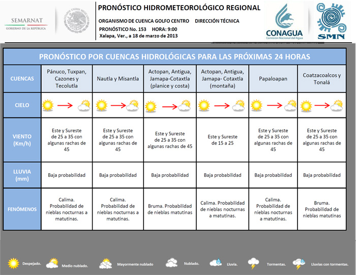 En las próximas 48 horas persistirá la entrada de aire marítimo tropical hacia la vertiente oriental del país, por lo que en la región dominará cielo despejado a medio nublado, baja probabilidad de lluvias y temperatura diurna alta a sensiblemente alta, así como viento del Este y Sureste de 25 a 35 km/h con rachas de 45 km/h. Ahora los pronósticos meteorológicos indican la probabilidad de que un frente frío ingrese al Norte del Golfo de México en el transcurso de mañana y se mueva hacia el centro del mismo golfo el miércoles; tal situación estará ocasionando que se presente un ligero escurrimiento de aire frío hacia la vertiente oriental del país, el cual a su vez provocará que hacia la tarde del miércoles en la región el viento se fije del Norte de 25 a 35 km/h con rachas de 50 km/h, aumenten los nublados con probabilidad de lluvias aisladas.