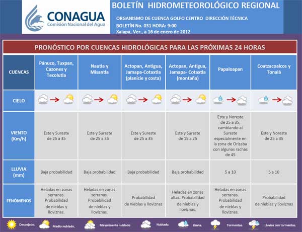 El sistema de alta presión sobre el Golfo de México tenderá a modificar sus características térmicas e interaccionar con el canal de baja presión atmosférica sobre el centro de los Estados Unidos, lo que favorecerá la entrada de aire marítimo tropical hacia la vertiente oriental del país y en la región la disminución de los nublados con recuperación de la temperatura diurna, así como viento del este y sureste con velocidades moderadas a frescas. En zonas serranas se mantiene la probabilidad de heladas al amanecer.